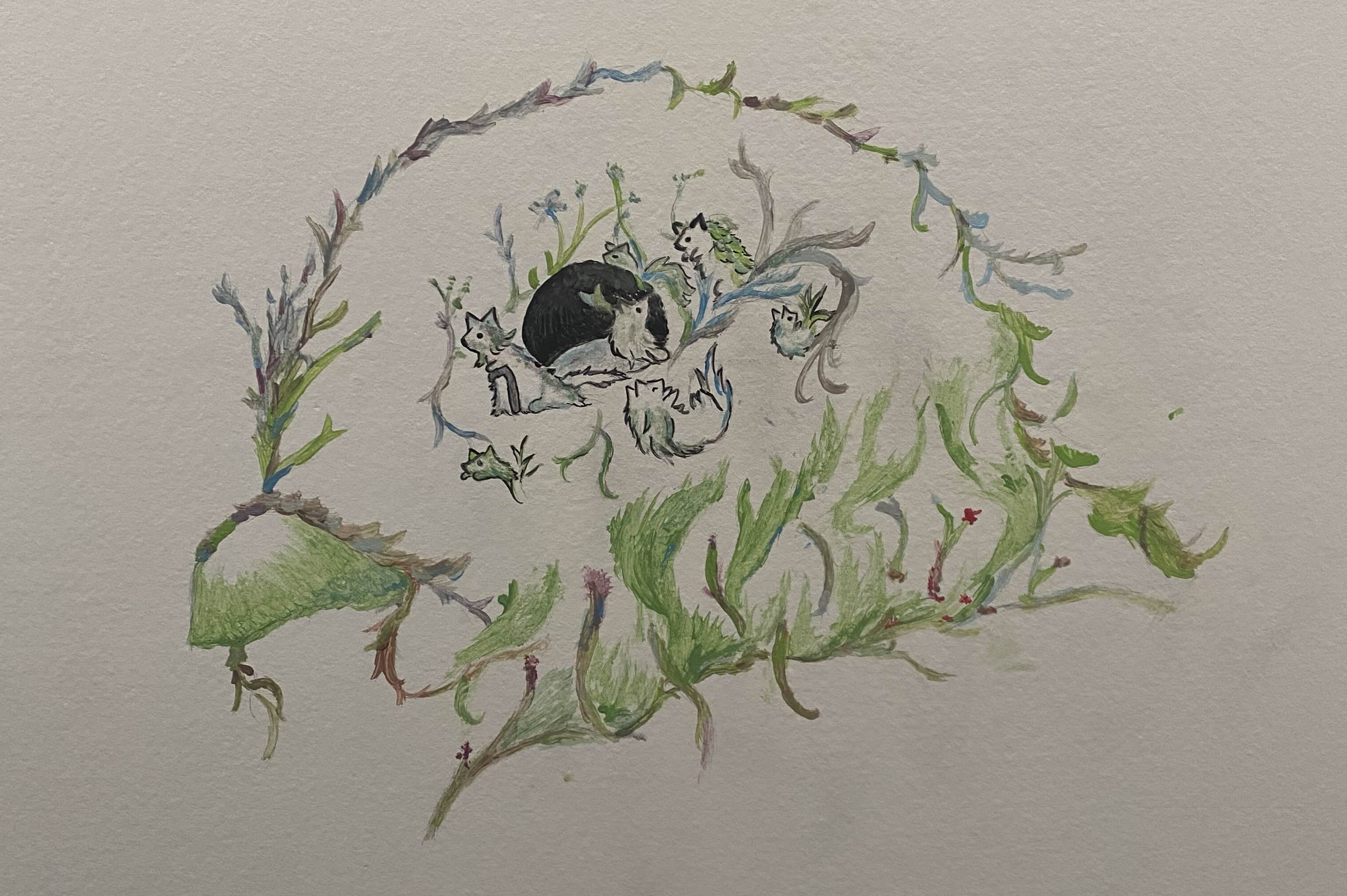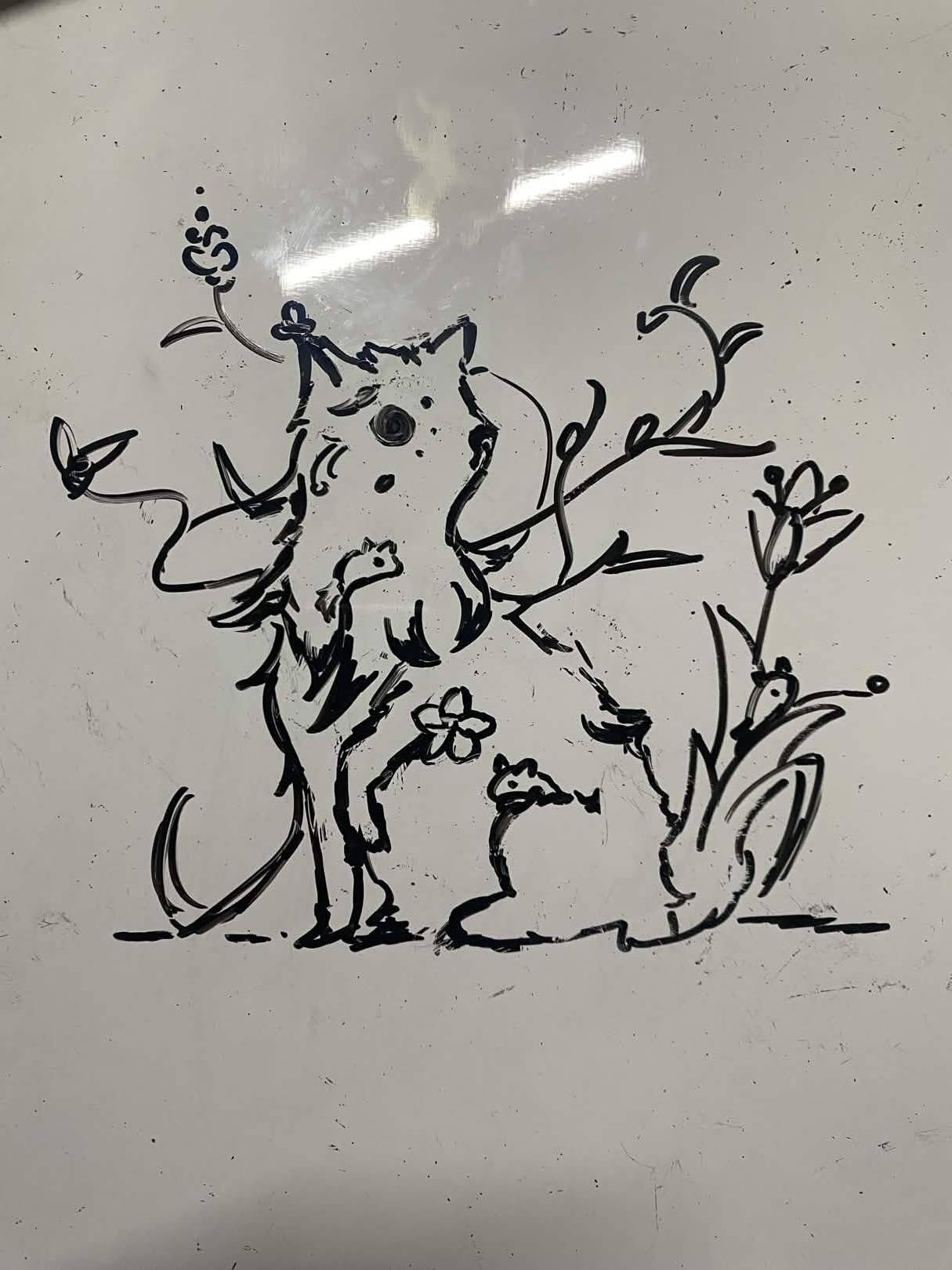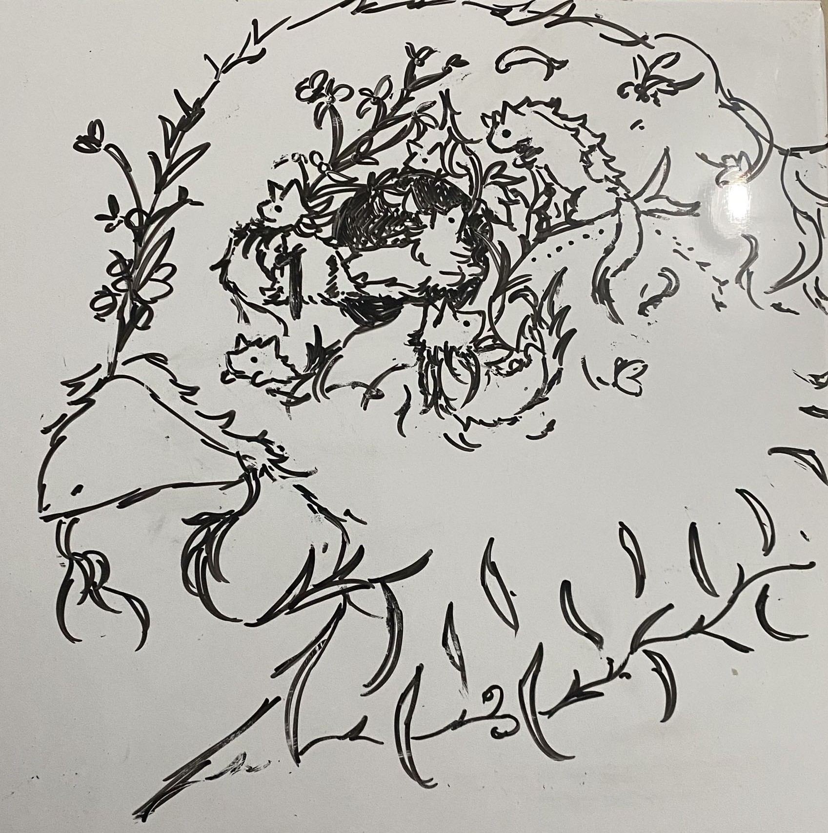 Bird mural with cat-like spirits, MIT Burton-Conner 4th Floor